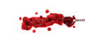 Blot the area with cold water. Treat the stain by applying a solution of dish soap and white vinegar, or hydrogen peroxide. Let it sit for at least 10 minutes. Rinse the area before washing.